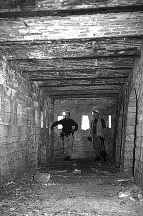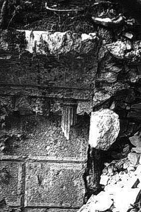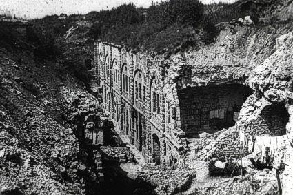 Mauerwerkskaserne 1915 (vor Beginn der Verdun-Schlacht): Durchschlag eines großen Kalibers durch 5 Meter Erdreich und 1,5 Meter Mauerwerk. (Tavannes, Alte Kaserne) |