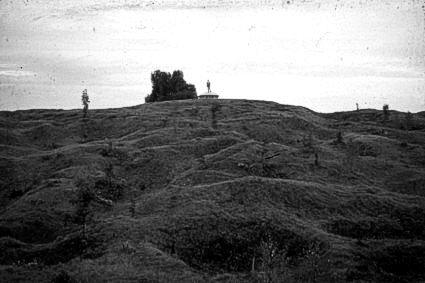 Typische Böschung einer betonierten Festungsanlage: Unter der verkraterten Oberfläche (Geschoßwirkung) liegen zumeist unversehrte Betonräume. (Froideterre, nordwestliche Böschung) |