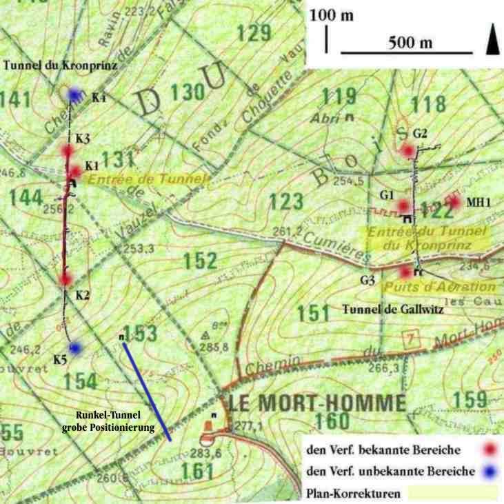 Lageplan der Tunnels auf der Höhe Mort Homme (Auszug IGN-Karte Verdun/Mort Homme (Ausgabe 1977), Korrekturen durch die Verfasser) |