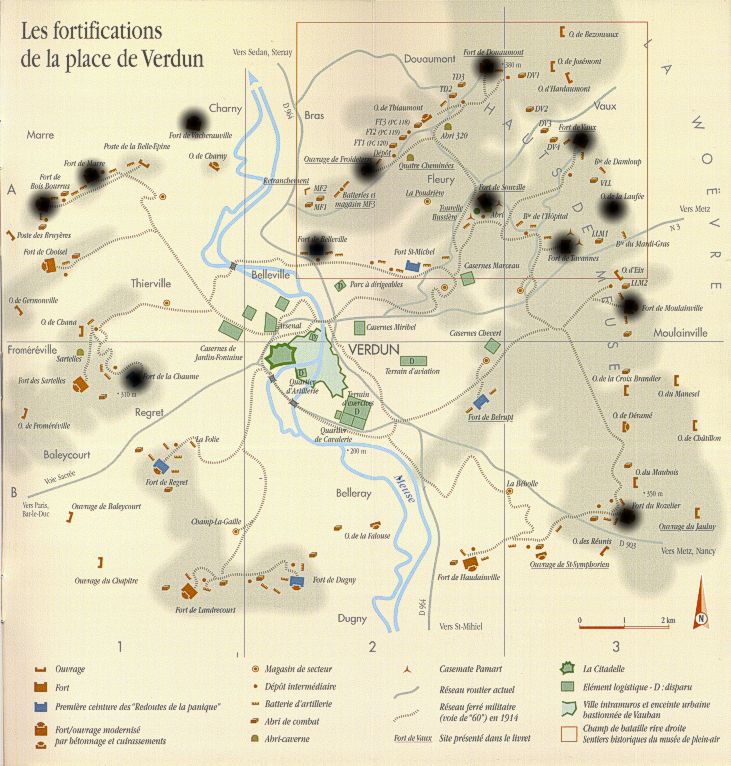 Plan der Festung Verdun - Anlagen mit "schwarzen Spots" sind in der Bildergalerie berücksichtigt. |