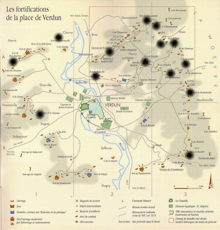 Plan der Festung Verdun - Anlagen mit "schwarzen Spots" sind in einer der Bildergalerien berücksichtigt. |