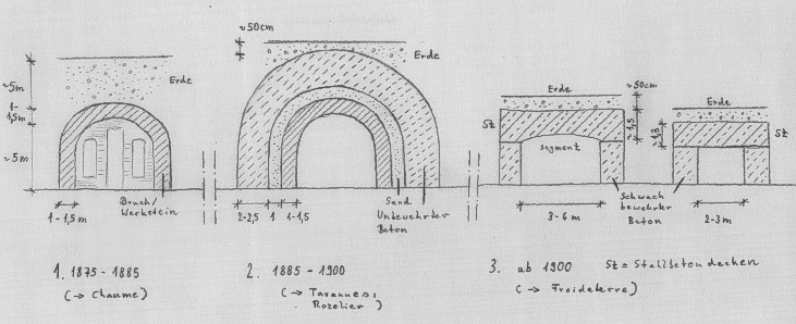 Zur Bildergalerie 1 (Konstruktionen) Politische Krisen, nur wenige Jahre nach dem Krieg, führen um 1875 zu überstürzten Baumaßnahmen (sogenannte „Panikforts“) mit dem Ergebnis erheblicher Konstruktionsmängel. Erst über die nächsten Jahrzehnte wird der Festungsbau nach dem ursprünglichen Plan mit mehr Muße und Sorgfalt betrieben und wehrtechnisch ständig aktualisiert. 2.1 Bauphasen und Standardkonstruktionen: 1875-85
